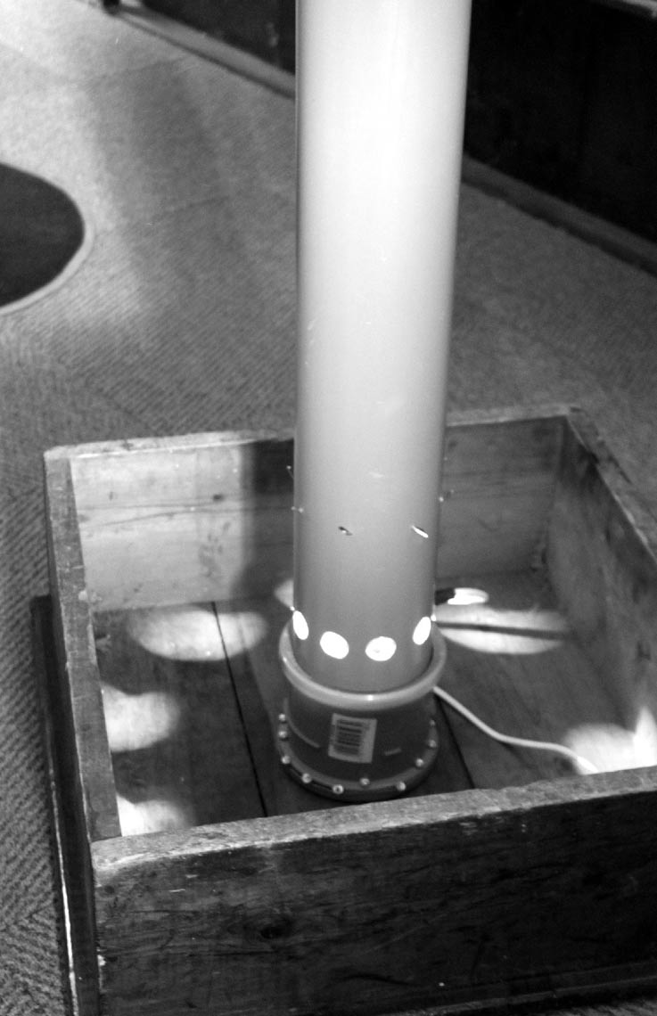 In response to this I have come up with the following design, that is low cost and is quick to make. The base is made from an inverted ringing box, that doubles up as an aid for shorter ringers while ringing is taking place. During ringing the heating tube can be stood/hung in the corner of the chamber, occupying the minimum amount of space. If you want you can drill a 25mm hole in the side of the top of the soil pipe and hang it on a coat hanger.