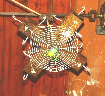 On this year’s branch outing, the spider at one tower drew particular comment as ‘several coat hangers and a door knob’. It was indeed made out of coat hangers, but they were formed into gracefully curved hooks, all carefully made to be the same. The door knob was an old fashioned metal one, rather inelegantly tacked on underneath to give it enough weight to come down when empty. Sadly I didn’t think to take a picture of it at the time, so you will have to imagine it.